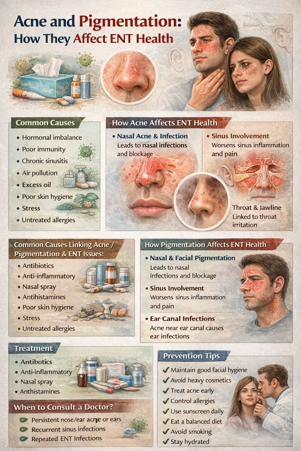 Acne and pigmentation can affect ENT health by causing nasal infections, sinus inflammation, ear problems, and skin irritation. Early care and hygiene...