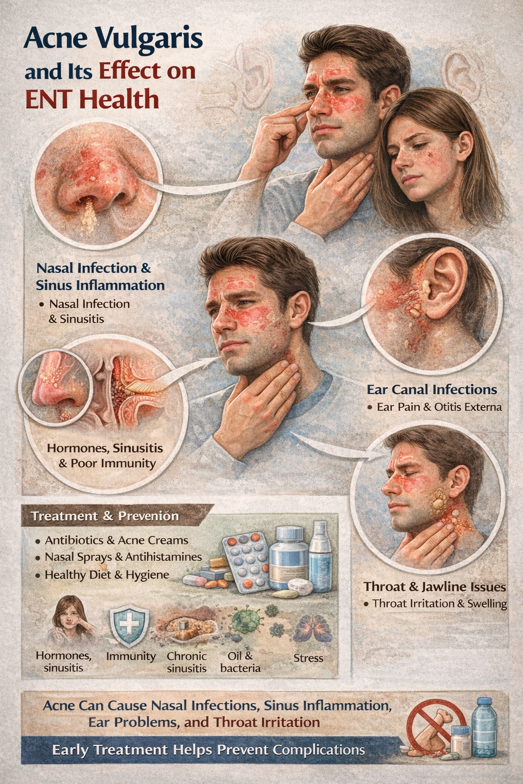 Acne vulgaris can affect ENT health by causing nasal infections, sinus inflammation, ear problems, and throat irritation. Early treatment and hygiene ...